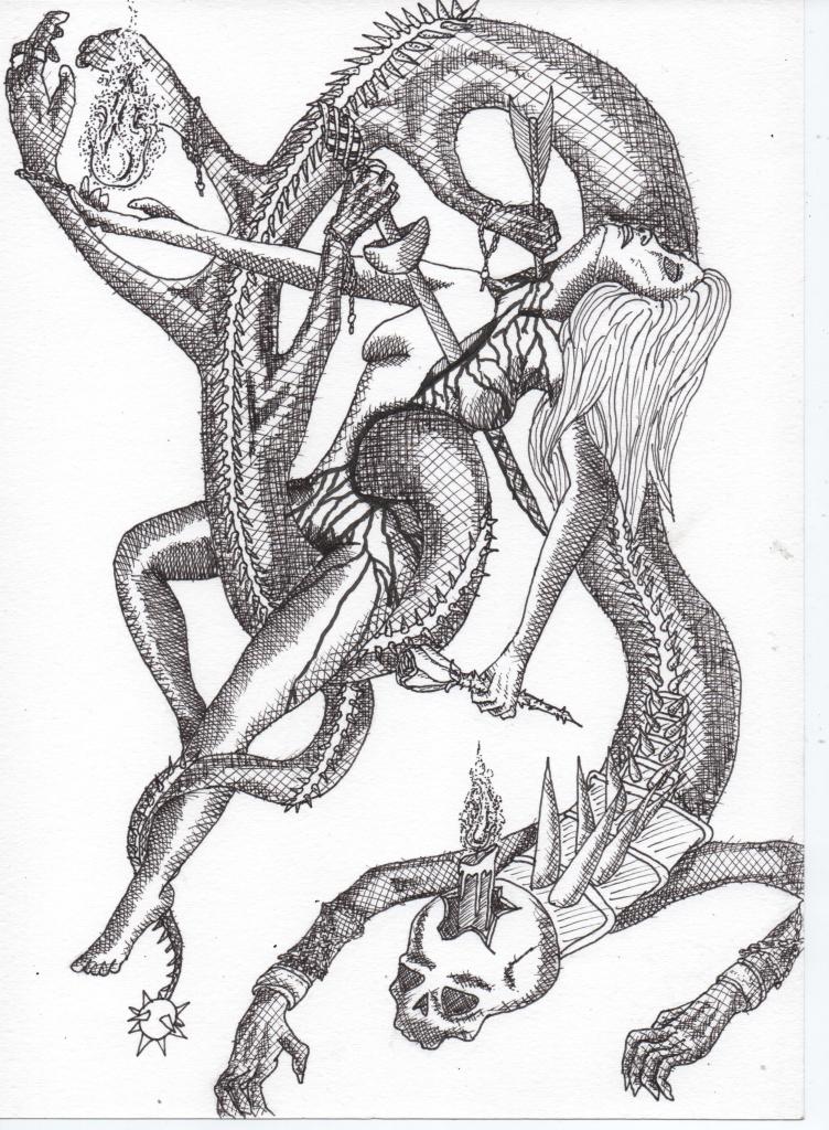 Es allí donde se introduce la violencia contra el bagaje cultural aprendido, el fuego es la destrucción del corpus simbólico asimilado a través de la mera osmosis ambiental ocurrida en el desarrollo inconsciente del individuo. La imagen del cuerpo consumiéndose en el fuego con un esqueleto de clavos y ropajes podridos es una metáfora del cambio que, necesariamente, debe experimentar el artista. Un abandono iconoclasta de lo aprendido en favor de la creación y forja de una voz propia que no responda a nadie sino al yo. Un yo que subsiste en medio del caos para seguir su propio camino y sus propios objetivos.