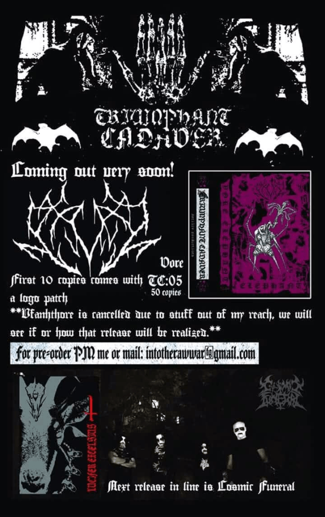 But of course, the album would gain more traction, attracting the attention of Triumphant Cadaver, that released a Pro Tape version with a limited edition patch. That edition included artwork by Italian graphic artist The Unknow.